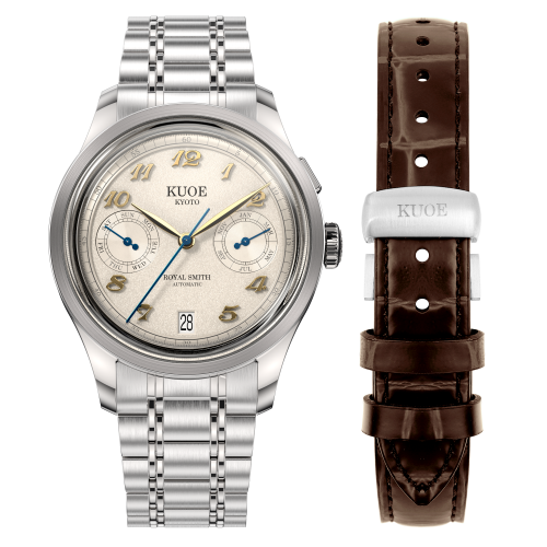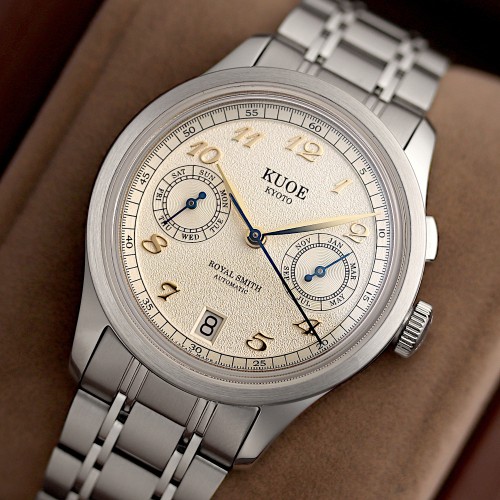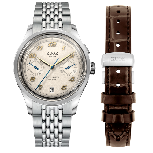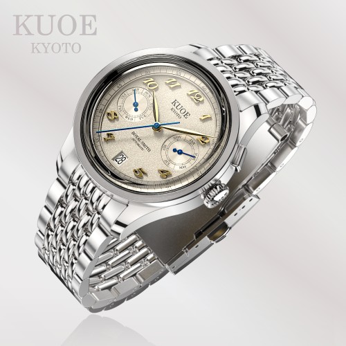 For the first time, KUOE has adopted CITIZEN MIYOTA's premium Japanese-made "Cal. 9122" movement. This high-beat movement features a triple calendar function with support for the date, day of the week, and month. The dial for this model has a subdued grain texture. The blue hands on the center seconds and subdials are thermally blued. The crystal is a boxed dome sapphire glass with AR coating. The Arabic numerals on the dial are classic Breguet numerals, reminiscent of antique watches of yesteryear. The indices on the outer circumference are raised, adding depth to the dial's appearance.